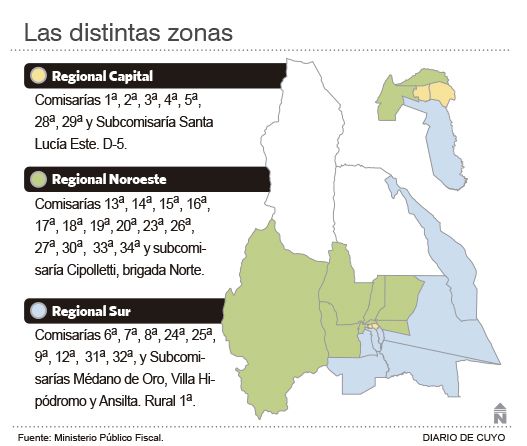 En ese sentido, ayer hubo una reunión clave entre el jefe de los Fiscales de la provincia, Eduardo Quatroppani, y el Jefe de Policía, Luis Martínez. En ese encuentro la Fiscal General de la Corte le presentó un posible esquema de cómo será la presencia de los nuevos funcionarios en las tres áreas que se ha dividido la provincia: Regional Capital, Regional Noroeste y Regional Sur, recordando que, según lo indica la ley, la segunda circunscripción judicial: Jáchal e Iglesia, no tendrá el sistema (ver infografía).