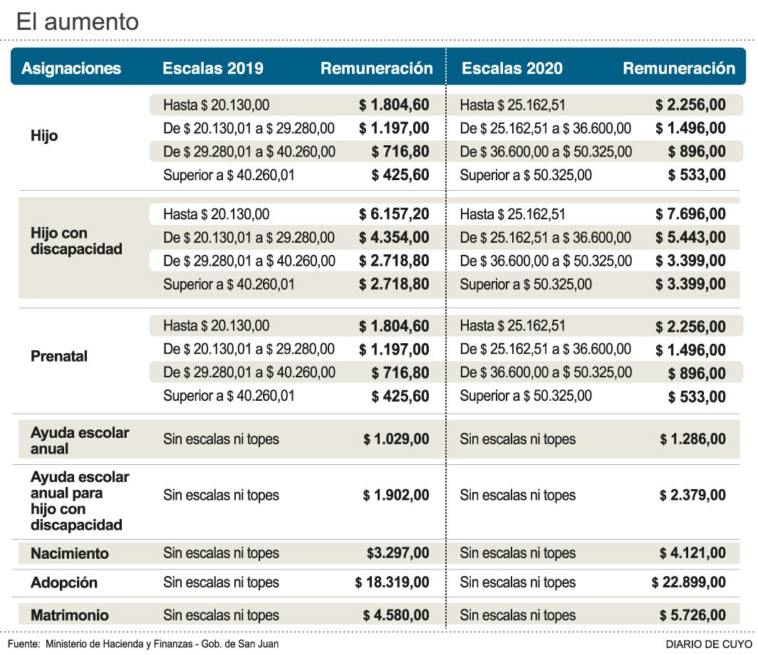 El beneficio contempla ocho rubros: hijo, hijo con discapacidad, prenatal, ayuda escolar anual, ayuda escolar anual para hijo con discapacidad, nacimiento, adopción y matrimonio. Son estos ítems los que experimentarán un aumento del 25 por ciento. El incremento se paga por tramos, dependiendo del salario del trabajador, por lo que, los que menos cobran son los que mayor remuneración obtienen. Así, en el caso del trabajador con un salario más bajo que hoy cobra 1.804,60 pesos de una asignación por hijo pasará a percibir 2.256 pesos. El ítem de adopción sigue siendo el rubro más alto, el cual no tiene escalas. De los 18.319 pesos que se percibe en la actualidad, se pasará a 22.899. En 2019 se había producido una suba del 40 por ciento con respecto a 2018.
