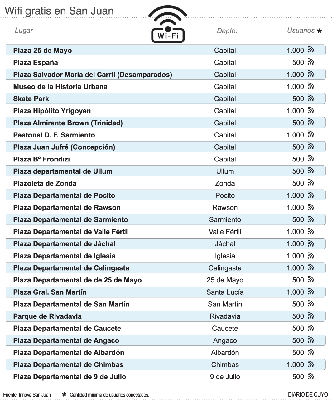 Antes de que cierre el año, los vecinos de cada uno de los departamentos podrán acceder a WiFi gratis desde sus plazas de cabecera. En Capital, habrá conexión en la Peatonal Domingo Faustino Sarmiento, en el Museo de la Memoria Urbana y el Skate Park, ubicado detrás de la terminal, además de algunos lugares conocidos como la plaza 25 de Mayo y otros espacios verdes como la plaza España y Desamparados. De esa manera, serán 28 puntos en total, en los que, en todos, el acceso será de manera gratuita, luego de registrarse como usuario. Para brindar tal servicio, la provincia invertirá 40 millones de pesos para que una compañía privada instale los equipos, mientras que el Estado se hará cargo de proveer de internet a cada lugar. Para poder concretar el proyecto, la empresa estatal Innova San Juan, a cargo del desarrollo de conectividad en toda la provincia, lanzó una licitación, por lo que a fin de mes se conocerá qué firmas están interesadas en aportar los equipos. Así, en un par de meses se hará la adjudicación para, luego, pasar a la instalación y tener los equipos conectados en diciembre. Según indicó el titular de la empresa estatal, Gustavo González, hay expectativa porque al menos, hasta el viernes pasado, cuatro firmas compraron pliegos.