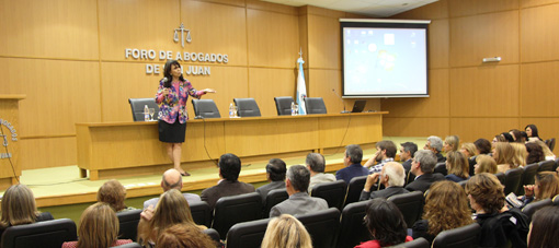 Gladys Álvarez habló de herramientas de acceso a la Justicia, Justicia de Paz y Casas de Justicia pero su presentación llamó la atención de los presentes, entre ellos secretarios, intendentes, ministros y jueces de San Juan al pedir un mayor diálogo entre los jueces con los vecinos.