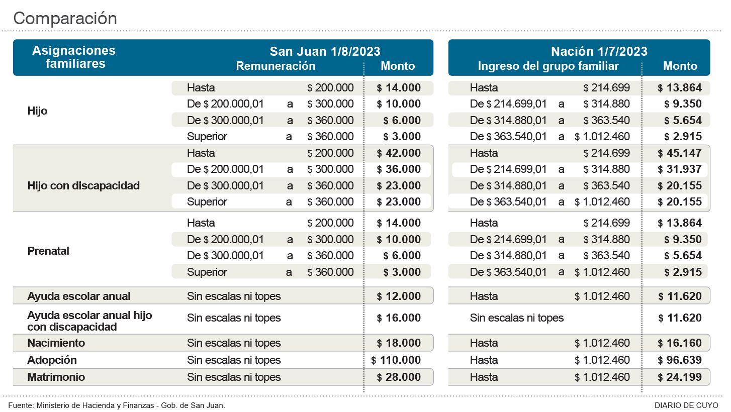 Según indicó la titular de la cartera contable, los nuevos valores van desde los 3 mil a los 14 mil pesos para las asignaciones por hijo; de 23 mil a 42 mil pesos para los hijos con discapacidad; de 3 mil a 14 mil para la asignación prenatal y se aumentan los montos de escolaridad, nacimiento, adopción y matrimonio. Además, también hay cambios en los tramos de las remuneraciones, que van desde los 200 mil pesos a los 360 mil. Todas las cifras superan a las que había establecido la Nación (Ver infografía). Además, desde Hacienda indicaron que, en la actualidad, impactará en unos 11.000 trabajadores estatales.