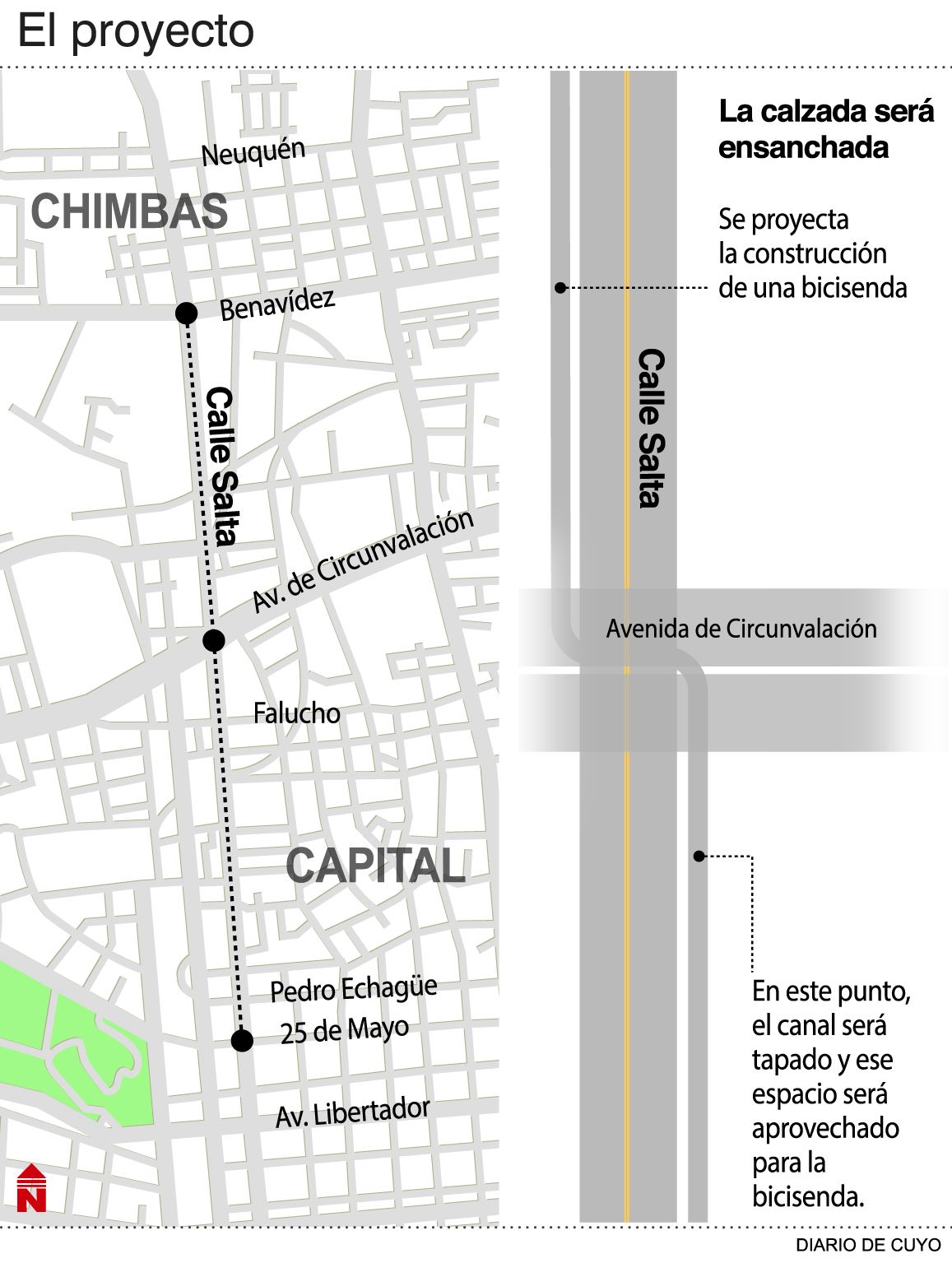 Actualmente esa arteria tiene un tramo donde el pavimento está muy deformado por lo que desde la municipalidad ya tenían pensado repavimentarla. Ahora el Ejecutivo decidió tomar la posta y llevar adelante un proyecto más integral para ensanchar la calle hasta el límite con Chimbas, con el agregado de sumar iluminaria y hasta una ciclovía. Desde hace casi un año que desde la gestión de Franco Aranda pretenden dar una solución al pavimento de calle Salta, sobre todo en la intersección Maipú hasta calle Paraguay, donde la calzada ha quedado muy deteriorada por el alto tránsito. Capital tiene jurisdicción sobre la calle hasta el cruce con avenida de Circunvalación, y es por eso que la repavimentación planteada por el municipio sólo abarcaba hasta ese lugar. A principio de año, cuando desde el Ejecutivo tomaron noticia de que en el mes de febrero Aranda iba a encarar la obra, decidieron levantar el teléfono y pedirle que frene los trabajos con la intención de llevar adelante un proyecto más integrador y superador. Ahora planean hacer una calle más ancha, con mejor iluminación y hasta que pueda contener una vía exclusiva para los ciclistas, pero no solo hasta Circunvalación sino que llegará hasta calle Benavídez, donde el tramo ya pertenece a Vialidad Provincial. (Ver infografía)