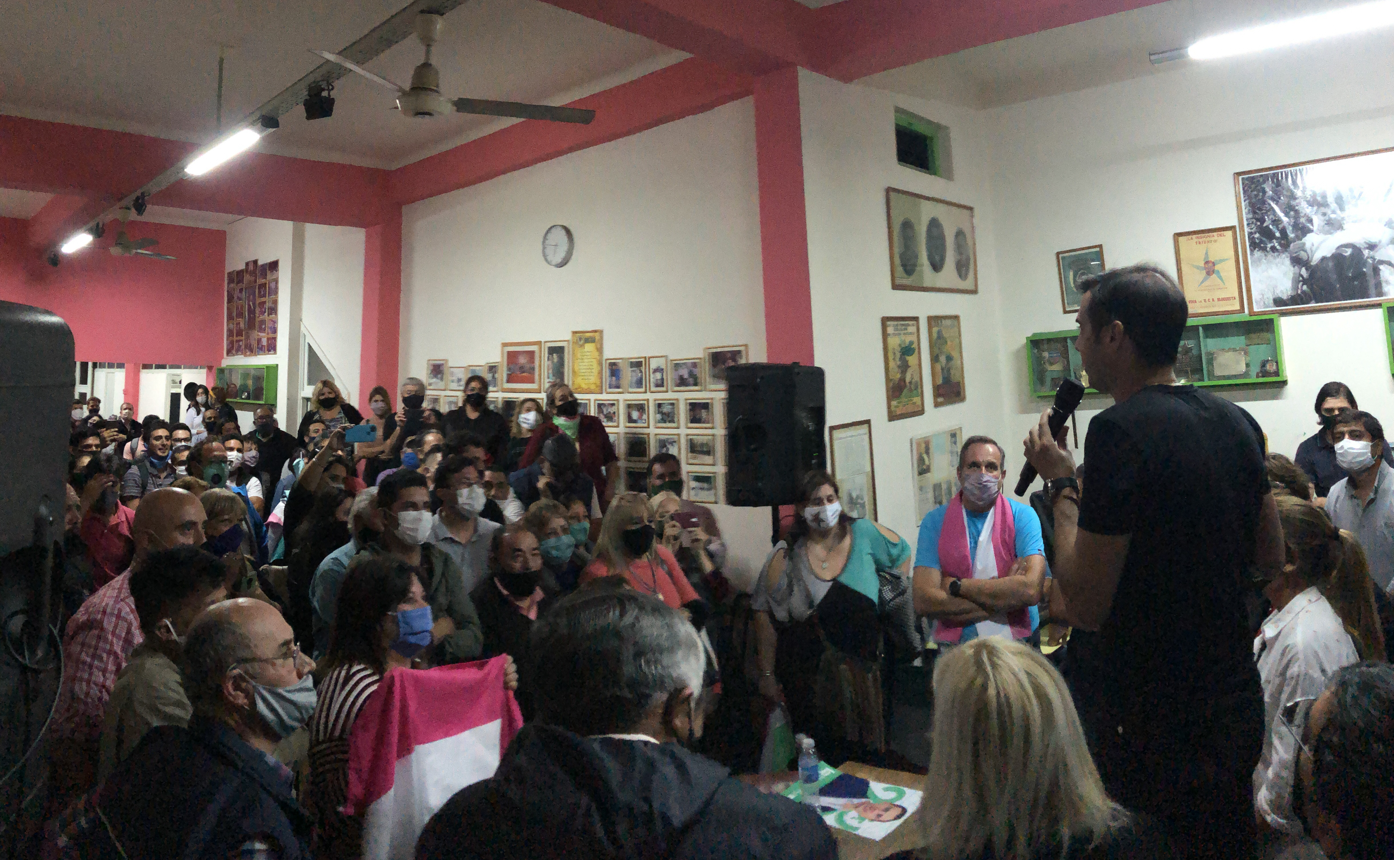 Diferente fue el escenario cerca de las 19, en la sede partidaria. Si bien, todos los presentes tenían colocado el tapabocas, hubo una concentración de afiliados en el interior del partido, ya que ese fue el lugar elegido para los discursos.