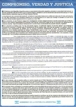 La solicitada, que está firmada por el "gobierno de la República Argentina", hace especial hincapié en los "documentos hasta ahora desconocidos" de Nisman que Rafecas citó en su fallo. "Un elemento de prueba en el que especialmente sustenta el desestimiento de la denuncia es el hallazgo en la fiscalía especial de la causa AMIA de dos escritos judiciales idénticos –firmados por el fallecido fiscal Nisman y fechados en los meses de diciembre de 2014 y enero de 2015, nunca presentados. Allí, Nisman solicitaba al Poder Ejecutivo que remitiera al Consejo de Seguridad de las Naciones Unidas un pedido de conminación a la República de Irán a fin de que detenga y extradite a sus nacionales acusados por el atentado terrorista", recordó.