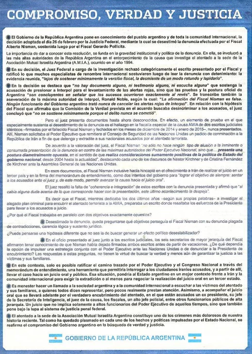 Bajo el título "Compromiso, Verdad y Justicia", el Poder Ejecutivo publicó fragmentos del fallo del juez Daniel Rafecas, quien la semana pasada decidió desestimar las acusaciones que el fiscal Gerardo Pollicita había realizado a partir de la presentación de Nisman antes de morir. Además, defendió una vez más la firma del memorándum con Irán para investigar el atentado a la AMIA y acusó al difunto fiscal de operar contra el Gobierno.