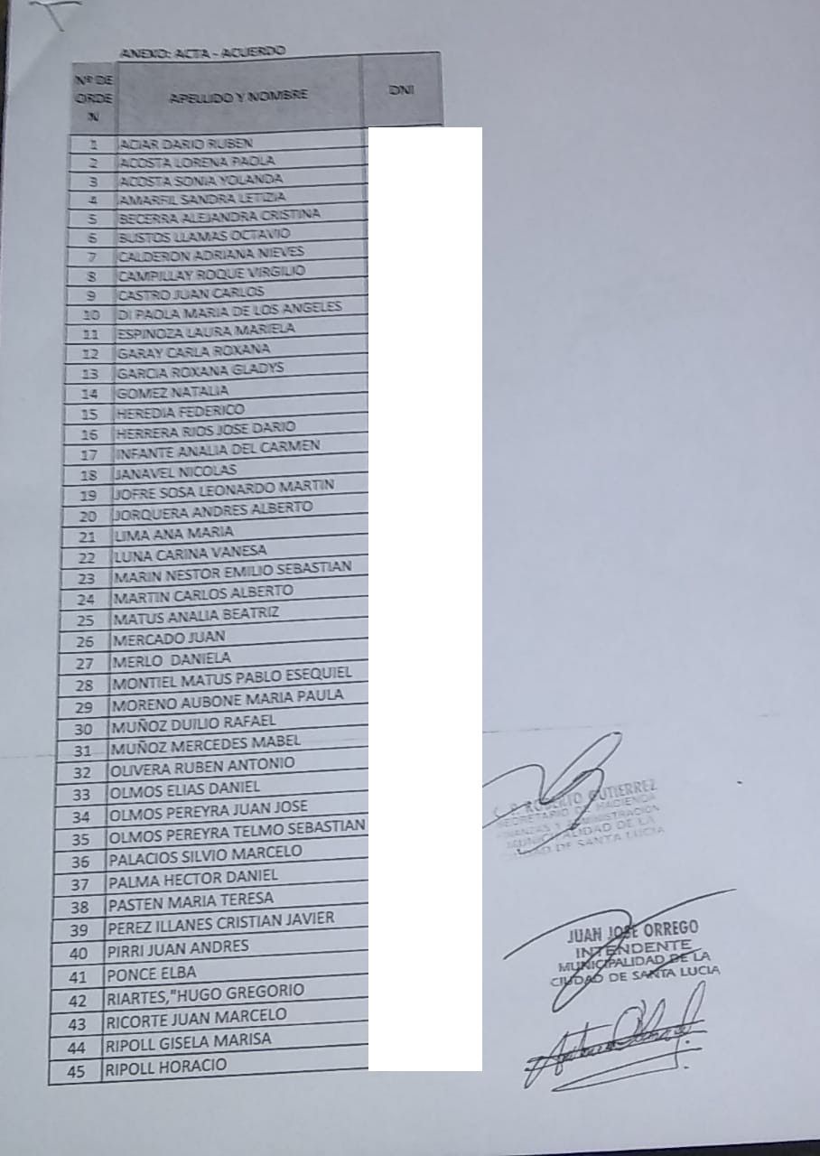 Porres datalló que algunos de los que aparecen en la lista son cuñados, hermanas, una prima y el marido de Eva Acosta, directora de Acción Social de Santa Lucía, quien es también presidenta de una unión vecinal. En este sentido, la concejal dejó en claro que Acosta "ha sido cuestionada por manejar recursos en negro con el municipio".