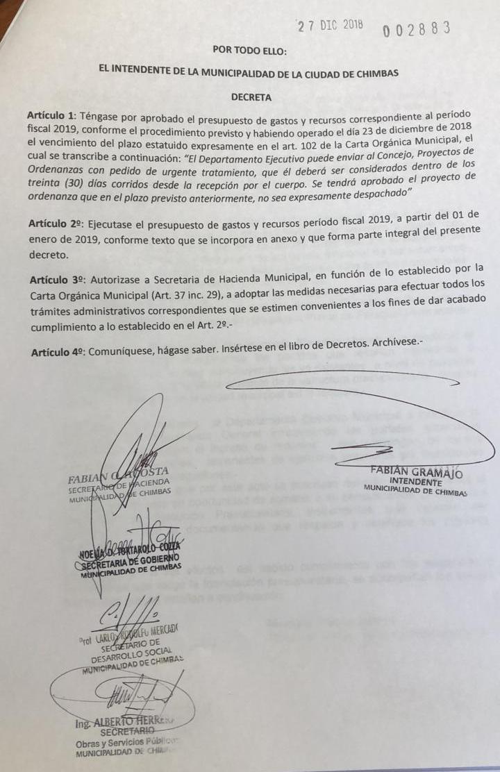 El gramajismo llevó al recinto legislativo el texto del Presupuesto el 23 de noviembre pasado, es decir con suficiente tiempo. También, en el texto, que lleva la firma del Intendente, dejó claro que hubo intenciones siempre de que salga aprobado del Concejo -ampliando el periodo para sesionar, por ejemplo- pero que así y todo fracasó este camino. Sobre estos cimientos se apoya el oficialismo para darle vía libre al decreto.
