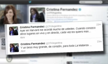 "Un beso muy grande, de corazón, para toda La Matanza… Ayer en Harvard me acordé mucho de ustedes. Cuando conozco otros lugares en vivo y en directo, cada vez los quiero más…", tuiteó la mandataria, mientras vuela de regreso a Buenos Aires tras una gira por los Estados Unidos.