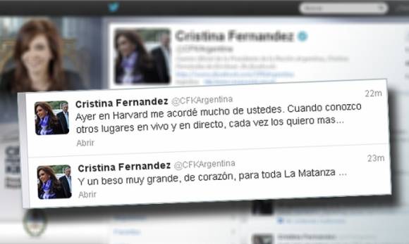 Buenos Aires, 28 de septiembre.- La Presidenta envió -vía Twitter- un saludo "muy grande, de corazón, para toda La Matanza" y dijo que se acordó "mucho" de sus habitantes, al participar ayer de una charla en la Universidad de Harvard.