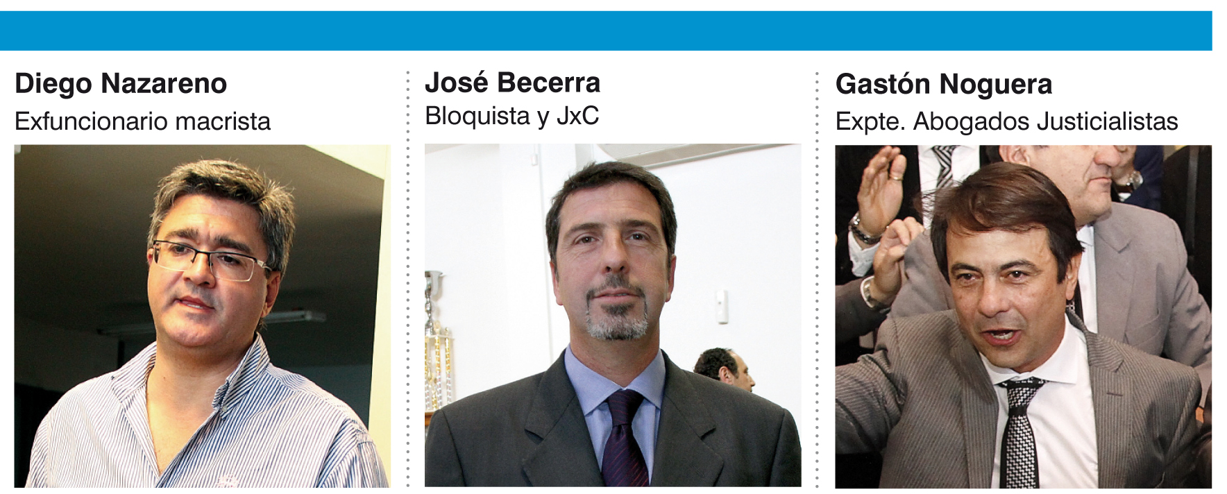 Entre los anotados por JxC, aparece Sarmiento, apoderada del Pro, referente de la agrupación Abogados en Acción y candidata al Parlasur de la lista Cambia San Juan, cuyo referente es el gobernador electo Marcelo Orrego. También figura Delgado, exvicepresidente del Foro de Abogados, exdirector local de Migraciones en la gestión macrista y expostulante a la Intendencia de Santa Lucía por San Juan al Futuro, del frente que conducía Orrego. En el listado está Nazareno, quien ocupó una Dirección en la Secretaría de Seguridad bajo el mando de Patricia Bullrich (hoy candidata a presidenta), con quien está alineada. Y la lista la cierra Becerra, bloquista, exvice del Foro, integrante de los equipos técnicos de JxC, quien, además, es apoderado de Sergio Vallejos, uno de los aspirantes a la Gobernación en la alianza que lideró Orrego. Por el lado del PJ, se encuentra Noguera, miembro de Fiscalía de Estado y exreferente de la Agrupación de Abogados Justicialistas.