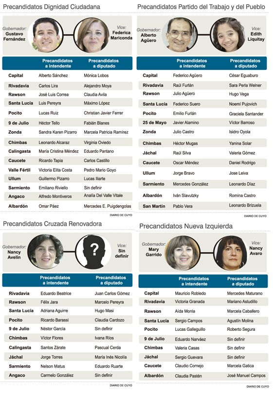Los más complicados eran los líderes de la Cruzada, ya que de manera intempestiva ayer anunciaron que se retiraban de la coalición San Juan Primero, que conduce Martín Turcumán. La noticia tomó por sorpresa a los armadores de ADN, el partido del empresario, ya que estaban convencidos de que la agrupación de la familia Avelín los acompañaría. Al menos hasta anoche no estaban claros los motivos de esa decisión. De igual forma, confirmaron que Lucila Avelín encabezará la lista de proporcionales y agregaron que trabajaban para completar el listado. El PTP propone como cabeza de diputados a Marcelo Solís, y a él le siguen: Ángela Ortiz, Miguel Ángel Nieto y Mónica Toledo. Fuentes de ese partido agregaron que completarían los 17 casilleros, aunque reconocieron que a veces es una tarea "casi titánica".