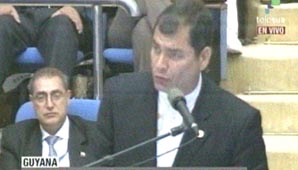 Buenos Aires, 26 de noviembre.- En su calidad de presidente protempore del organismo, Correa abre la sesión de cierre de la Unasur y según lo previsto, nueve de los doce presidentes que componen el bloque, presentes en Georgetown, harán un homenaje al ex presidente argentino.