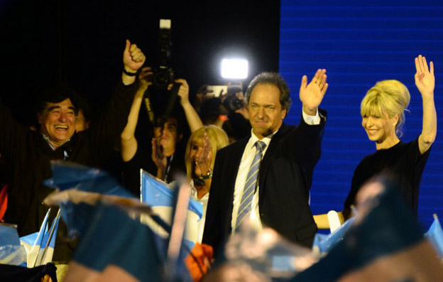 Buenos Aires, 10 de agosto.- El candidato presidencial del Frente para la Victoria, Daniel Scioli, esperó que transcurrieran los primeros 20 minutos del lunes para salir a escena a brindar su discurso en el búnker del oficialismo, que esta vez eligió el teatro Luna Park.