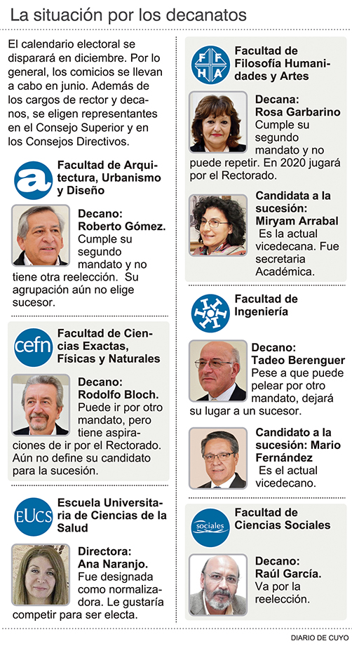 Después del rector, son los cargos ejecutivos de mayor importancia en la Universidad Nacional de San Juan (UNSJ). Se trata de los decanos, quienes dirigen las facultades y, además, tienen asegurados lugares en el Consejo Superior. En las elecciones del año que viene se pondrán en juego dichos puestos y hoy se presenta un escenario diverso. De las tres autoridades que pueden ser reelectas, sólo una buscará repetir mandato: Raúl García, en Ciencias Sociales. En cambio, Tadeo Berenguer le dejará la postulación en Ingeniería al vice Mario Fernández mientras que Rodolfo Bloch aseguró que jugará por el Rectorado, pero para Exactas todavía no hay una figura consolidada. Entre los que no pueden continuar en sus decanatos están Rosa Garbarino, en Filosofía, cuya agrupación definió que la vice Miryam Arrabal sea la candidata, y Roberto Gómez, en Arquitectura, en cuyo sector aún no hay una decisión tomada sobre el aspirante a la sucesión (ver infografía).
