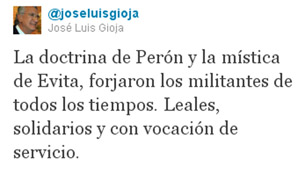 San Juan, 17 de noviembre.- "Feliz #DiadelaMilitancia A 39 años del regreso del Gral. #Perón a la #Argentina", escribió José Luis Gioja en su cuenta de Twitter.
