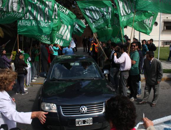 Cuando el gobernador José Luis Gioja se retiró de la Cámara de Diputados, lo hizo acompañado por un nutrido grupo de militantes, sobre todo de la JP y de Kolina, el movimiento que a nivel nacional lidera la ministra Alicia Kirchner, que portaban carteles y pancartas en apoyo al mandatario provincial.