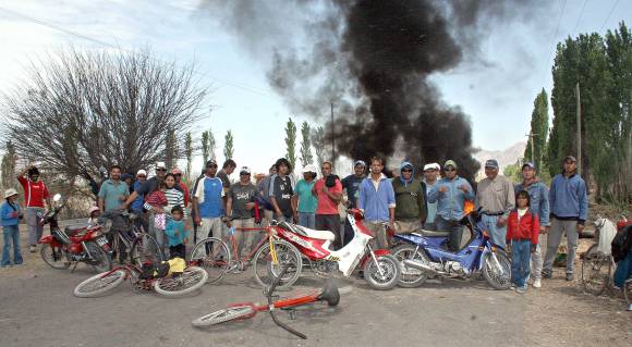Mientras arden un par de cubiertas con la ayuda de basuras cortadas de una acequia cercana, un par de jóvenes apuran las últimas cucharadas de un guiso preparado a las apuradas en una vieja olla. Son parte de unos 50 trabajadores ulluneros que desde las 4 de la mañana del martes están apostados en el cruce de las calles Aviadores Españoles y Laterza, a unos pocos kilómetros del lugar donde la UTE Techint-Panedile construye el dique Punta Negra. Y con el argumento de que "no nos vamos a mover de acá hasta que nos dé una solución", dicen que están a la espera de que los llamen. Mientras tanto cortan el tránsito de cualquier vehículo que lleve materiales o cualquier tipo de insumos para la construcción del dique, pero dejan pasar al resto de la gente.