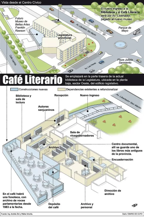 El café literario que quieren construir en la Legislatura de la provincia ya tiene fecha. El secretario Legislativo de la Cámara de Diputados y una de las manos derechas del vicegobernador Rubén Uñac, Emilio Baistrocchi, aseguró ayer que se licitará en febrero y que los trabajos empezarán un mes después. En San Juan es una obra inédita que costará unos 800 mil pesos y que tiene como plazo de finalización el mes de septiembre. Entre otras cosas, habrá a disposición del público una colección de autores sanjuaninos, una fonoteca con audios históricos y un archivo digital de las todas las leyes sancionadas desde 1923.