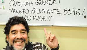 Buenos Aires, 26 de octubre.- En la foto se puede ver a Maradona señalando un cartel con la frase: "Cris, una grande. Triunfo aplastante: 53,96%. Too much!!". La misma fue publicada hoy, en la cuenta de Facebook de la Presidente.