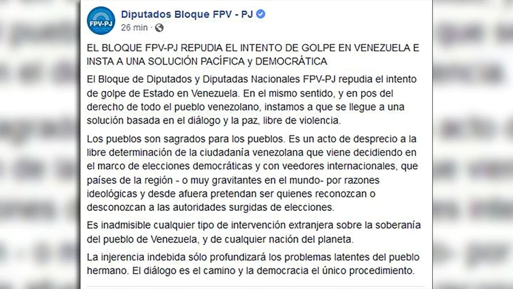 En un comunicado, los legisladores repudiaron lo que consideran un "intento de golpe de Estado en Venezuela" al tiempo que "en pos del derecho de todo el pueblo venezolano, instamos a que se llegue a una solución basada en el diálogo y la paz, libre de violencia".