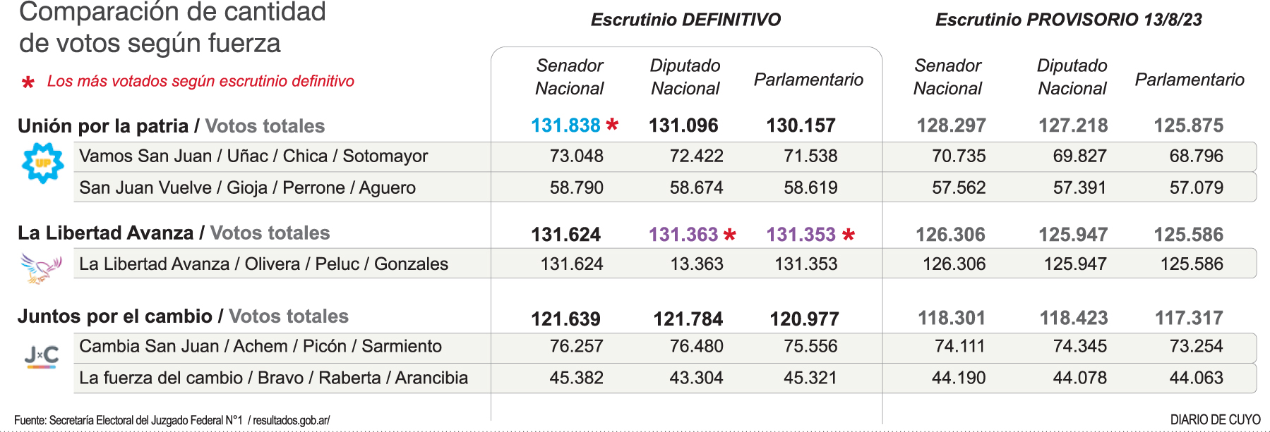 El crecimiento de las cifras obedece a que subió la cantidad de electores computados, ya que en el definitivo hubo 436.796, mientras que, en el provisorio, 417.668. En el caso de los candidatos de Milei, se le debe agregar que se sumaron los que no se habían contabilizado en ciertas mesas de Rawson y Chimbas, por ejemplo. El frente UxP retuvo el máximo escalón en la categoría de senadores, aunque se redujo la distancia, luego de que en el recuento provisorio se había impuesto en la de diputados nacionales y parlasur.