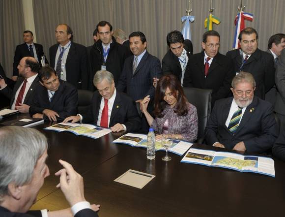 Sergio Gahona, intendente de la IV región de Chile (en la foto, a la izquierda, junto a los presidentes Piñera, Cristina y Lula. Enfrente, Kirchner), se mostró ayer ante DIARIO DE CUYO conmovido por la muerte del ex presidente Kirchner. El funcionario informó que habló "con nuestro amigo el gobernador José Luis Gioja y expresamos nuestra consternación y nuestra sentida condolencia por el sensible fallecimiento de ese gran hombre que ha sido don Néstor Kirchner, no solo para la Argentina, sino también para Sudamérica".