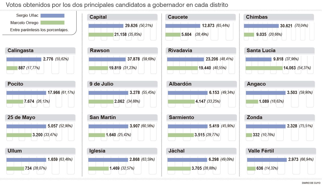 Hubo otros casos con diferencias, aunque menos elevadas. En Albardón, Jorge Palmero, que quiere ser el sucesor de Juan Carlos Abarca, obtuvo casi cuatro puntos menos que este último, quien viene ejerciendo una dinastía en el departamento. Por el lado de Ullum, en el Frente Con Vos, el candidato a diputado Daniel Albarracín se ubicó ocho puntos por arriba de Romina Solera, que va por la Intendencia. Por el PJ, Simón Ortíz, que va por la banca en Diputados, superó por 4,69 puntos a su compañero David Domínguez.