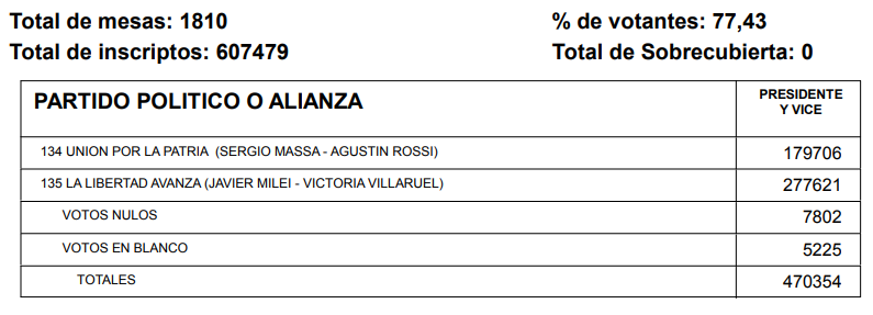 En la mañana de este miércoles la Secretaría Electoral terminó con el escrutinio definitivo del balotaje celebrado el pasado donde se consagró en San Juan como el candidato más votado la fórmula de Javier Milei – Victoria Villarruel frente a la de Sergio Massa – Agustín Rossi-