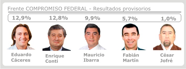 El representante del PRO en la provincia llegó a su bunker de la mano de Roberto Basualdo, quien abaló el triunfo de Cáceres en el frente Compromiso Federal. Lo hizo sobre Enrique Conti, Mauricio Ibarra, Fabián Martín y Cesar Jofré.