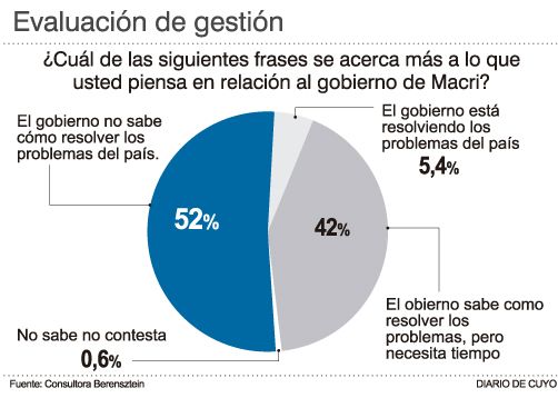 No obstante, hay una mirada crítica hacia Macri, ya que el 52 por ciento piensa que no sabe resolver los problemas del país, aunque un 42 por ciento indica que necesita tiempo.