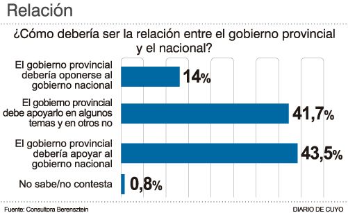 El 43,5 por ciento apoya la idea de que el Gobierno provincial debería apoyar al nacional. En cambio, los que sostienen que debería oponerse llegan al 14 por ciento. La muestra revela el rechazo a un escenario de enfrentamiento, como el que ha planteado el exgobernador y actual diputado nacional José Luis Gioja, quien llegó a sumarse a un pedido de juicio político del kirchnerismo contra el Presidente y a pararse en la vereda de enfrente en muchos proyectos de ley que fueron vistos con buenos ojos en la gestión local.