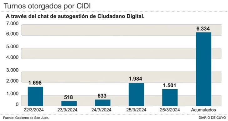 La funcionaria fundamentó esta buena calificación general en la agilidad con la que opera este nuevo sistema. Agregó que entre el 22 y el 26 de marzo, el Cidi otorgó 6.634 turnos, un total de 1.200 por día en promedio, con pico el día lunes y descenso el fin de semana.