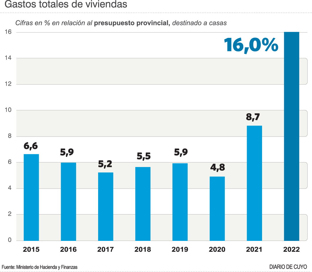 La construcción de casas siempre fue un pilar clave dentro de la gestión de Sergio Uñac, ya que no sólo satisface una alta demanda de viviendas de la sociedad, sino que también sirve para impulsar la economía, con la compra de materiales y la generación de mano de obra. Esa impronta se ha visto reflejada en el presupuesto 2022, ya que, gracias a los recursos que llegarán desde Nación, habrá un incremento considerable de los fondos destinados a casas. Si se tiene en cuenta el 8,7 por ciento que fue asignado en el presupuesto 2021, esa cifra crecerá a casi al doble para el año que viene, dado que se irá al 16 por ciento (ver infografía). Incluso, si se comparan los 9.615 millones de pesos para este ejercicio con los 36.876.483.000 pesos plasmados para el año que viene, el incremento es de 283,5 por ciento.