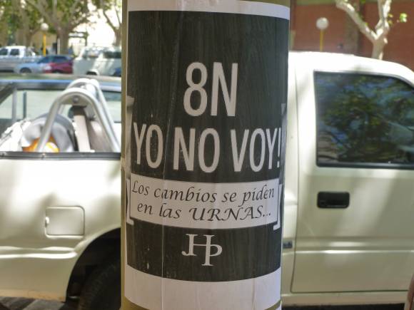 Quienes se oponen a la movilización utilizaron la pegatina callejera para manifestar su postura. “8N Yo no voy, los cambios se piden en las urnas” citan los carteles que aparecieron en los pilares de las principales calles del microcentro.