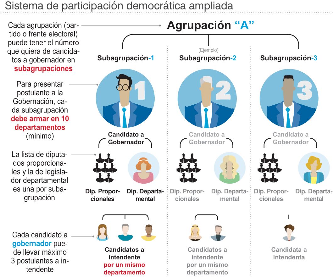 El proyecto del nuevo Código Electoral establece que los partidos o frentes que se anoten para el comicio de 2023 se definirán como "Agrupación política", las que pueden contener líneas internas que se denominarán "Subagrupaciones". Estas, dentro de una coalición, deben presentar, además de la fórmula de Gobernador y vice, una lista de candidatos a diputados proporcionales y legisladores en los departamentos en los que jueguen, siempre que sean al menos 10. Cada subagrupación (el espacio interno, liderado por un referente) podrá presentar hasta tres postulantes a una Intendencia y cada uno de ellos debe tener una sola lista de concejales (Ver infografía).