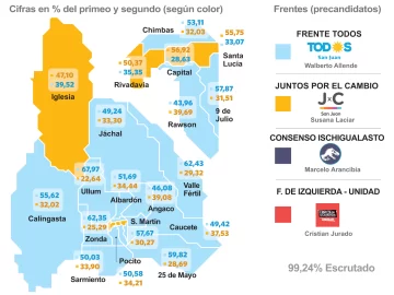Iglesia, Santa Lucía, Rivadavia y Capital son las comunas en las que la oposición ganó. La mayor diferencia se dio en Capital donde los candidatos de Marcelo Orrego sacó 56,83 por ciento, frente a los 28,73 obtenidos por el Frente de Todos.