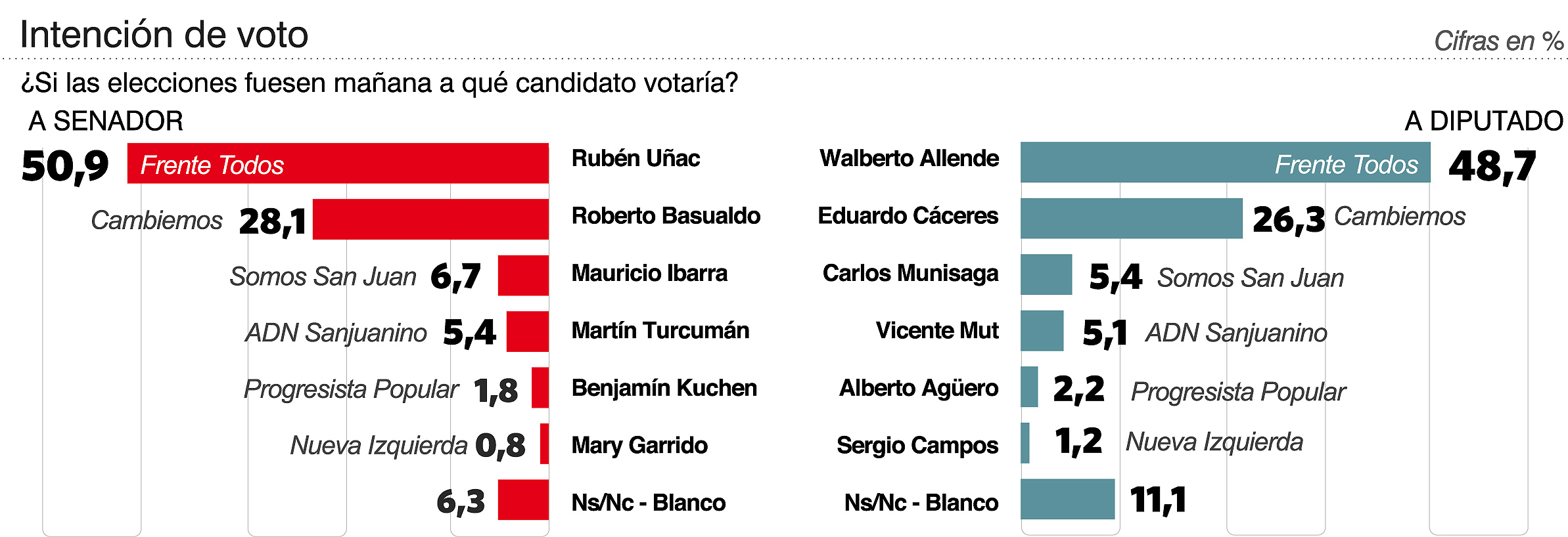 A poco menos de un mes para la contienda en la que se elegirán legisladores nacionales por San Juan, el frente oficialista Todos estira levemente la brecha con su rival más cercano, la coalición Cambiemos. Según los números de la consultora Acierto, la lista de senadores que encabeza Rubén Uñac, hermano del Gobernador, y la de diputados, que lidera Walberto Allende, consiguen 22 puntos de diferencia con respecto a las que tienen como máximos exponentes a Roberto Basualdo y a Eduardo Cáceres. En las Primarias Abiertas, Simultáneas y Obligatorias (PASO), elecciones que sirven como sondeo oficial, la ventaja había sido de 18 puntos.