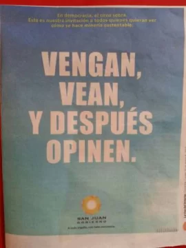 San Juan 17 de julio.- Tras la solicitada de Greenpeace en diario Clarín, donde se criticaba el accionar del Gobernador Gioja en torno a la actividad minera, el Gobierno provincial lanzó su respuesta a nivel nacional. En medios de comunicación de alcance masivo, desde el lunes, comenzó a reflejarse una campaña donde se busca dar el punto de vista oficial en torno al cuidado del medio ambiente y la actividad minera en San Juan. Dicha campaña se extenderá por 15 días y busca generar impacto para contrarrestar las críticas de la ONG ambientalista.