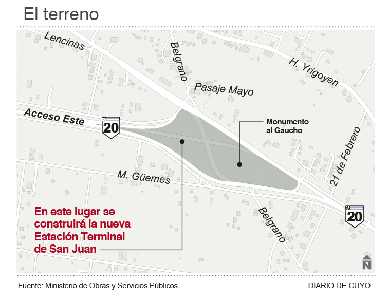 El predio adquirido es el que está emplazado sobre Ruta 20, donde está ubicado el Monumento al Gaucho, en Santa Lucía. Tiene una dimensión de casi 10 hectáreas, y contempla la explanada, con algunas calles de acceso que son parte de la ruta nacional. Es que la nueva terminal estará contenida dentro del proyecto que apunta a transformar en autopista ese acceso provincial, con una primera etapa que va desde la Avenida de Circunvalación hasta dicho monumento. Esa obra se está trabajando en paralelo junto con Vialidad Nacional.