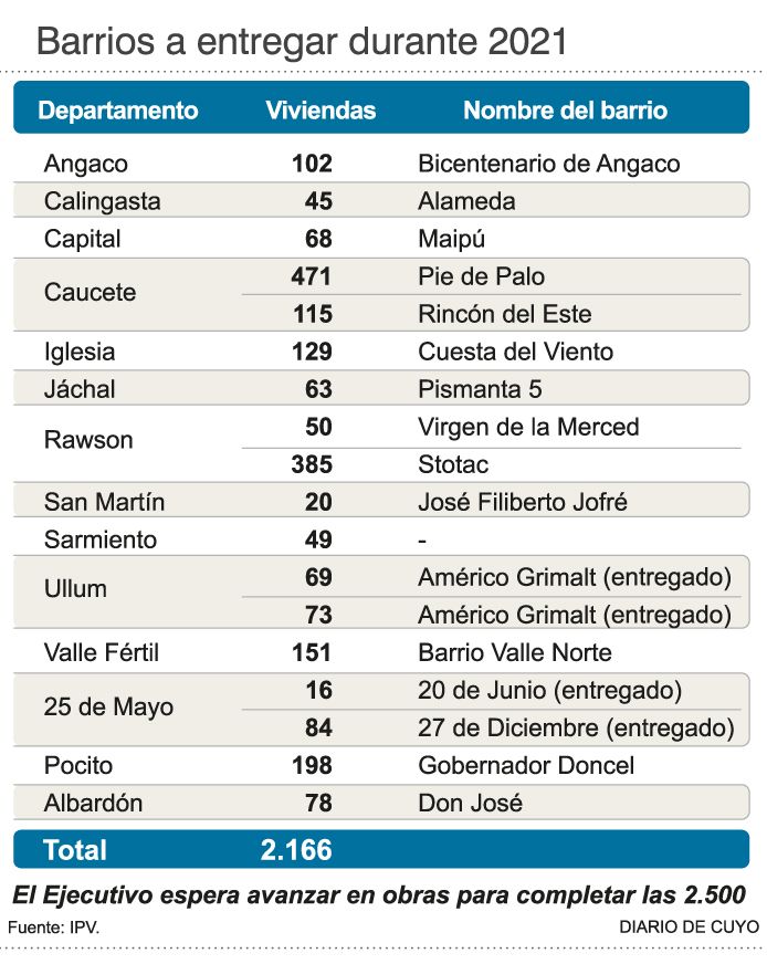 La edificación de hogares, dentro de la ejecución de obra pública, ha sido un pilar para la gestión uñaquista y, según explicó el propio Gobernador, será uno de los puntos que destacará en su mensaje anual que dará el jueves en la Cámara de Diputados. La estimación de entregar 2.500 viviendas durante este año surgió de la mano del titular del Instituto Provincial de la Vivienda (IPV), Marcelo Yornet, en la entrega de ayer de 84 casas pertenecientes al barrio 27 de Diciembre, en 25 de Mayo, acto que encabezó Uñac. Según dijo el funcionario, "tenemos una gran cantidad de barrios que estarán listos este año (Ver infografía), por lo que, como mínimo, adjudicaremos 1.500 y calculamos alcanzar los 2.500 a fin de año". En esa línea, explicó que, entre los proyectos más avanzados, se encuentra el barrio Bicentenario de Angaco, con 102 casas y que se entregará en mayo; el complejo Alameda de Calingasta, con 45 viviendas; el barrio Gobernador Doncel de Pocito, con 198 casas, previsto para junio; y el barrio Pie de Palo de Caucete, que cuenta con 471 unidades y que estará listo en agosto.