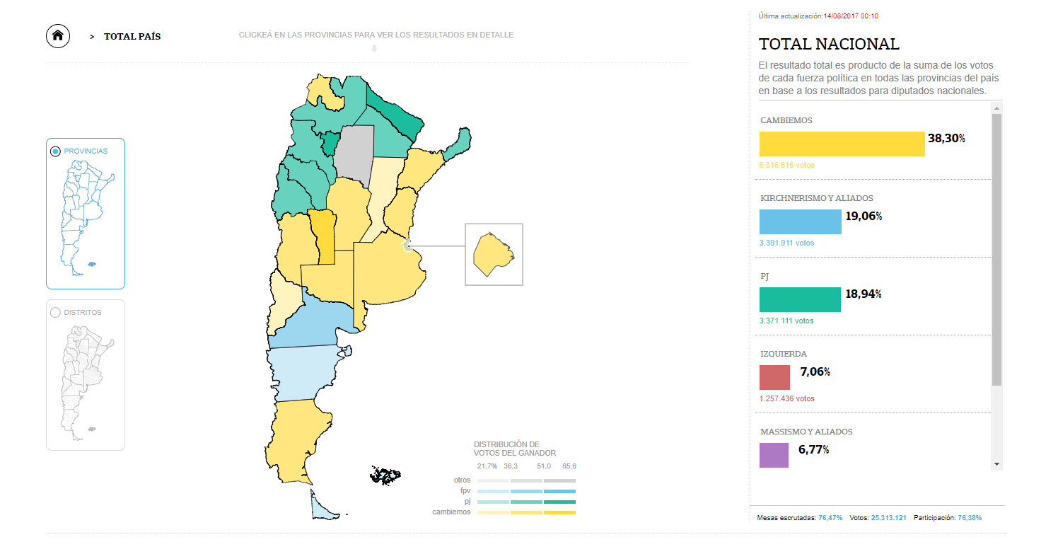 Las Primarias Abiertas, Simultáneas y Obligatorias van llegando a su fin y, con casi la totalidad de mesas escrutadas en todo el país, los datos arrojan que el Partido Justicialista se hizo fuerte en el Noroeste del país y Cambiemos arrasó en las provincias más pobladas.