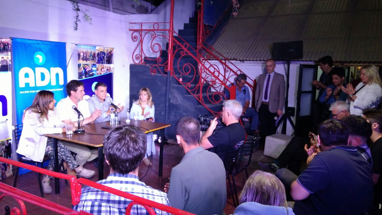 En la sede de ADN hubo conferencia de prensa mientras los primeros números comenzaron a aparecer. El aspirante a la senaduría, Martín Turcumán, y su compañero de lista para el cargo de Diputado, Vicente Mut, hablaron con los medios frente al medio centenar de personas que los acompañó.