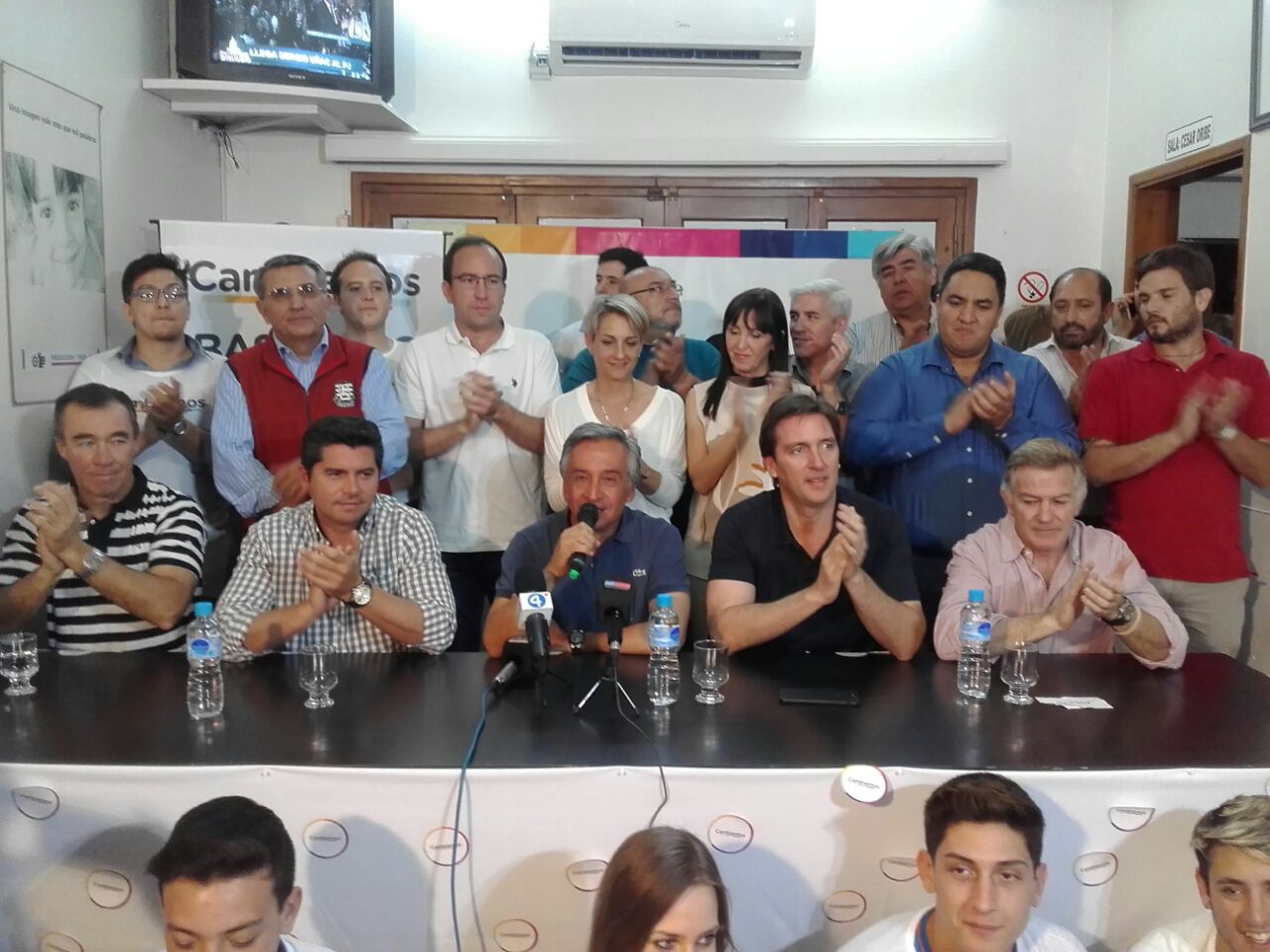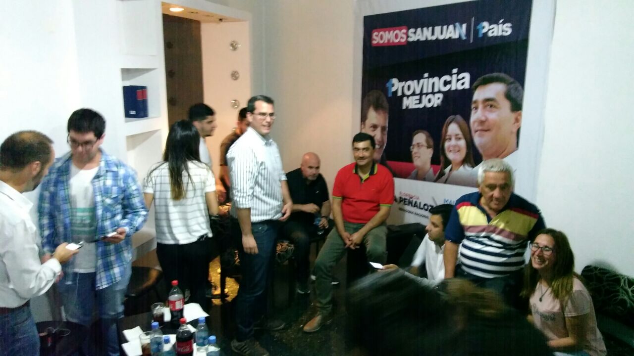 Los miembros de Cambiemos San Juan, con el candidato a Senador Roberto Basualdo a la cabeza, comenzaron a reunirse en el búnker del partido ni bien cerraron los comicios. Mientras esperaban los resultados, los más jóvenes integrantes del partido prepararon los globos de colores y los candidatos aprovecharon para dar entrevistas a los medios que se acercaron. Después, ofrecieron una conferencia de prensa.