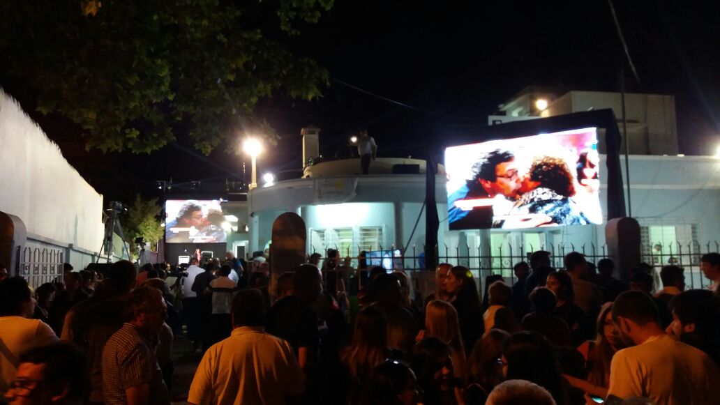 Los miembros del Frente Todos se reunieron en la calle, frente a la sede, para esperar los resultados oficiales. Antes de las 22 llegaron el gobernador Sergio Uñac y el candidato a Senador, su hermano Rubén Uñac, y se reunieron al resto de los funcionarios que aguardaban en el lugar. Mientras tanto, se oyó la música que el partido utilizó durante toda la campaña y se vieron spots en pantallas gigantes.