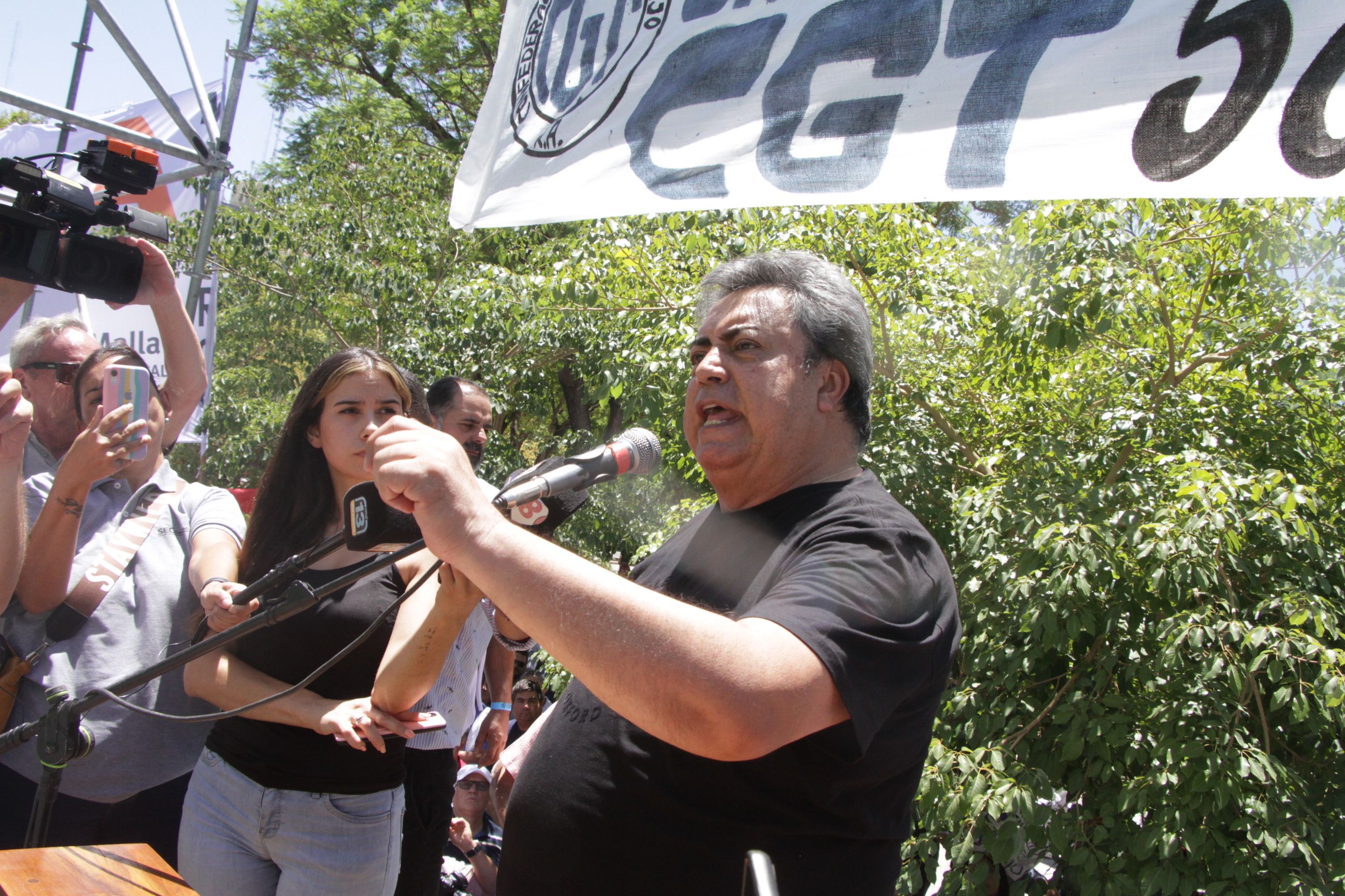 La movilización comenzó a las 11 de la mañana y a las 13 inició el acto, en el escenario montado en el costado oeste de la Plaza 25. Primero, se entonaron las estrofas del Himno. Luego, el padre Martín Reta, de la Catedral, dio una bendición y, posteriormente, comenzó su discurso Eduardo Cabello, líder de la CGT sede San Juan.