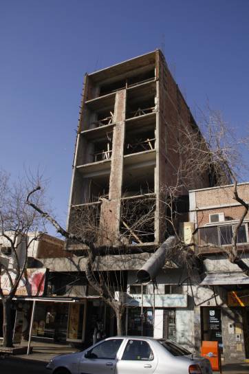 Nadie sabía bien por qué se había detenido la obra de tamaño edificio. Algunos arriesgaban a decir que hacía 30 años que fue abandonado, mientras que otros hablaban de 40 años, e incluso el mito popular llegó a decir que estaba torcido o que el material utilizado no era el mejor. Y no faltó el que se despachó y aseguró que estaba embrujado, pero eso sí, era parte del paisaje urbano y estaba incorporado en las retina de los sanjuaninos que a diario paseaban por el centro. Para encontrarlo, basta con levantar la mirada al caminar por la vereda sur de avenida Libertador entre Gral. Acha y Tucumán, donde está en el interior de la Galería Laprida. Allí está, tan imponente como tenebroso, su esqueleto flaco y a simple vista frágil, estuvo al descubierto por al menos 50 años, pero hace unos 45 días que se empezó a ver obreros limpiando.