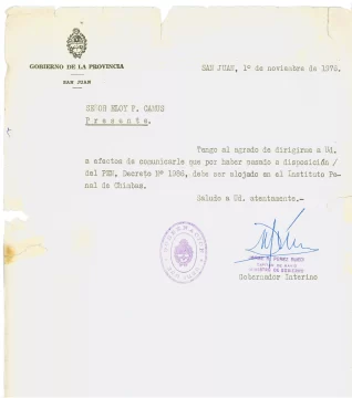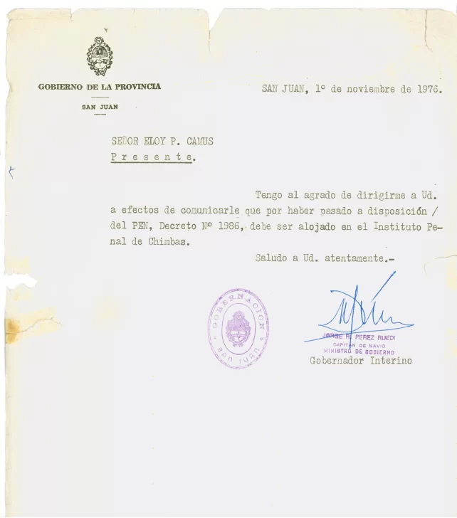 Consumada la profanación institucional del 24 de marzo de 1976, la intervención clavó sus garras en San Juan y mandó detener a la mayoría de los funcionarios del gobernador Eloy Camus, que inmediatamente fueron reemplazados por militares. Entre ellos, un joven José Luis Gioja (entonces director del Instituto Provincial de la Vivienda), su hermano César, dirigentes gremiales, legisladores de la mayor parte del arco político de entonces, otros políticos del oficialismo que no integraban el Gabinete y representantes de la oposición. Todos pasaban a sufrir detención en el RIM 22, Instituto Penal de Chimbas, o en sus domicilios por espacios prolongados. De regreso de Buenos Aires a donde había viajado imprevistamente un día antes del golpe, a don Eloy se le ordenó la detención domiciliaria en su casa de calle Ameghino. A partir de ese momento fueron numerosas las personas que sigilosamente trataban de verlo, lo que con el tiempo hizo ‘temer‘ a los invasores algún ‘riesgoso‘ desenlace de esos encuentros. Así, a los 8 meses y una semana, y sin argumentar motivo convincente, pero con una extraña cordialidad, Camus fue notificado oficialmente que debía ser ‘alojado en el Penal‘. Manteniendo el verbo de una convocatoria a cualquier reunión social, el firmante aprovechaba para saludarlo y despedirse ‘atentamente‘. La nota tenía fecha 1 de noviembre, y le fue entregada en mano en su casa por un joven y nervioso oficial de bajo rango, que esbozó para ello una dura sonrisa de circunstancia.