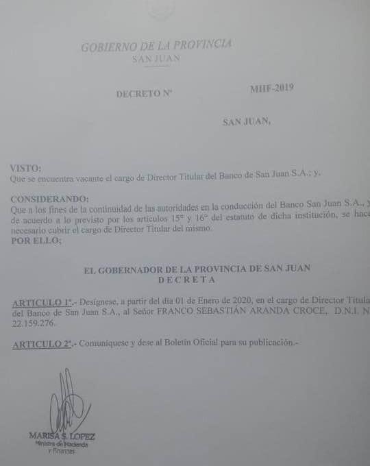 El exintendente de la Capital, Franco Aranda, fue designado director del Banco San Juan. La medida se tomó a través de un decreto del Ejectivo provincial, a cargo del gobernador Sergio Uñac.