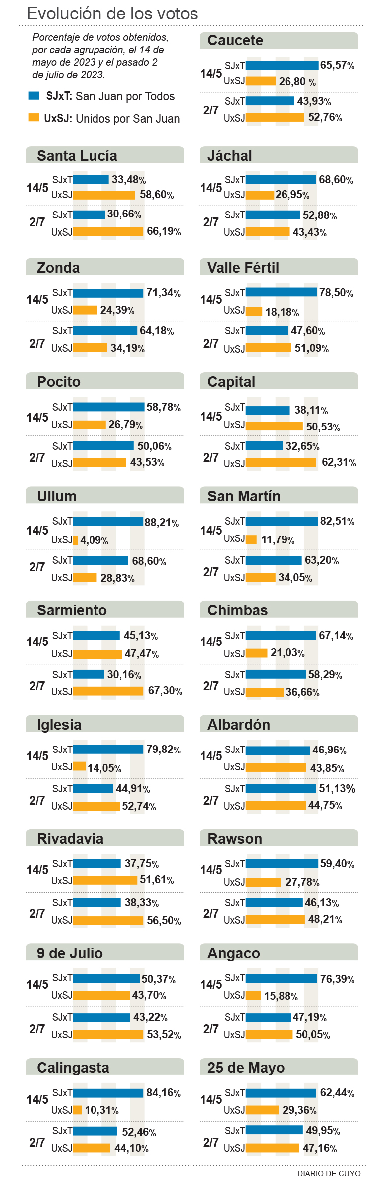 Previo a la elección, en el oficialismo daban por descontado derrotas en distritos como Capital, Rivadavia y Santa Lucía, ya que son departamentos en los que el orreguismo se hizo fuerte. Lo que no preveían eran resultados adversos en Caucete, Rawson, 9 de Julio y Angaco y que UxSJ haya crecido considerablemente en terrenos como Pocito, donde estuvo a punto de superar al uñaquismo (ver Infografía). Al final, los sufragios le otorgaron 10 distritos para la oposición y 9 victorias, en algunos puntos ajustadas, para San Juan por Todos. Por otro lado, dentro de la agrupación, el giojismo fue la fuerza más votada.