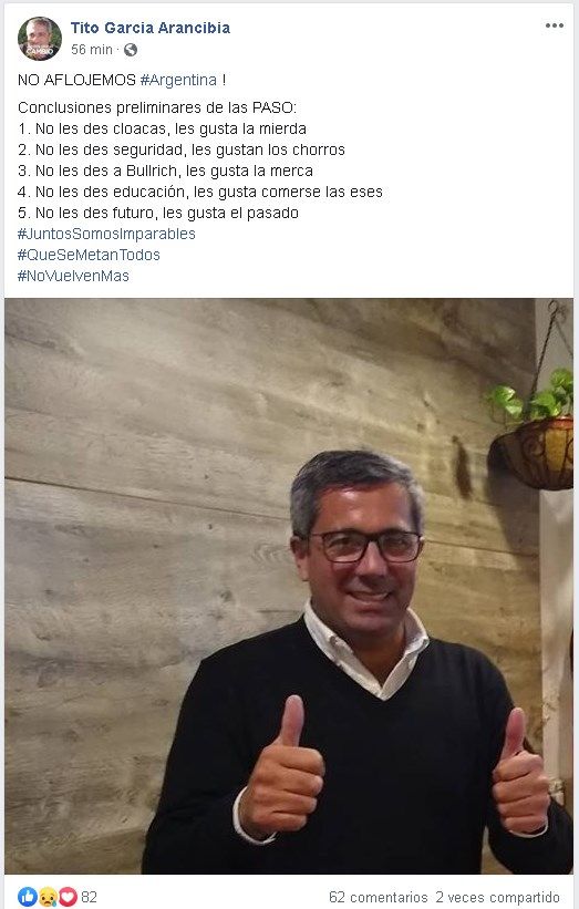 Luego del revés electoral que sufrió Juntos por el Cambio en las PASO de este domingo, un funcionario macrista sanjuanino salió con los tapones de punta en su cuenta de Facebook y realizó varias frases que liquidaron a los votantes de Alberto Fernández.